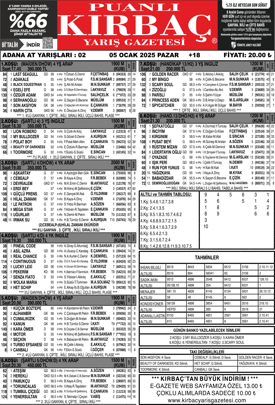 Bülteniniz KIRBAÇ, 05.01.2025 Tarihli, 1.592 ₺ ikramiye tutarlı Adana altılısını tahmininde bularak okurlarımıza kazandırdı.