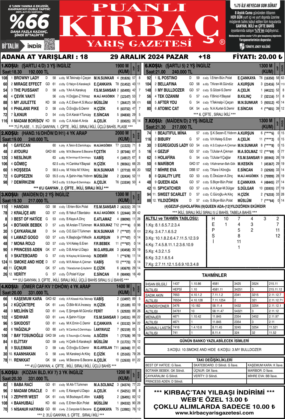 Yazarlarımızdan Sadık AKIN, 29.12.2024 Tarihli, 6.891 ₺ ikramiye tutarlı Adana altılısını tahmininde bularak okurlarımıza kazandırdı.