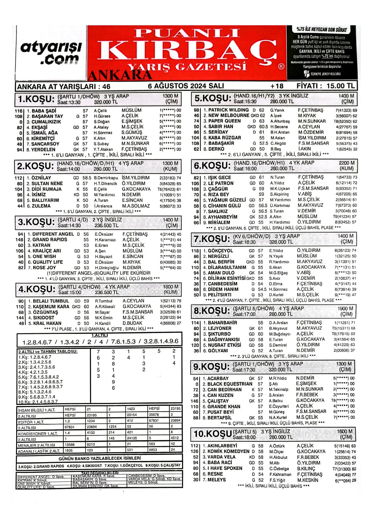 Bülteniniz KIRBAÇ, 06.08.2024 Tarihli, 915 ₺ ikramiye tutarlı Ankara 2.Altılısını tahmininde bularak okurlarımıza kazandırdı.