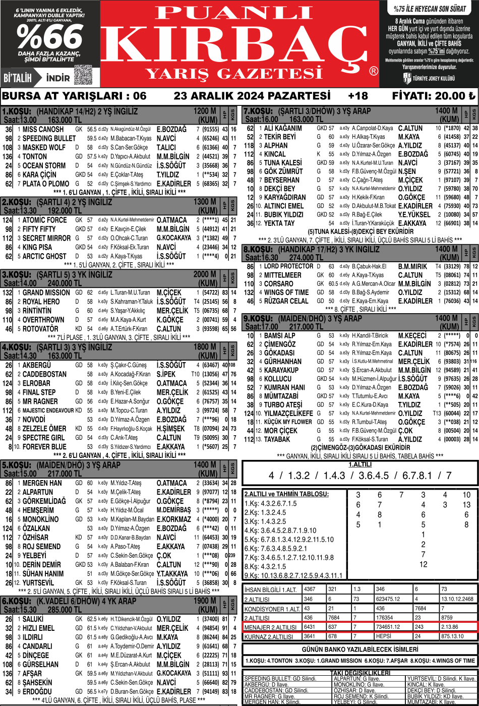 Yazarlarımızdan Bursa Menajerimiz, 23.12.2024 Tarihli, 1.622 ₺ ikramiye tutarlı, Bursa 2.Altılısını tahmininde bularak okurlarımıza kazandırdı.