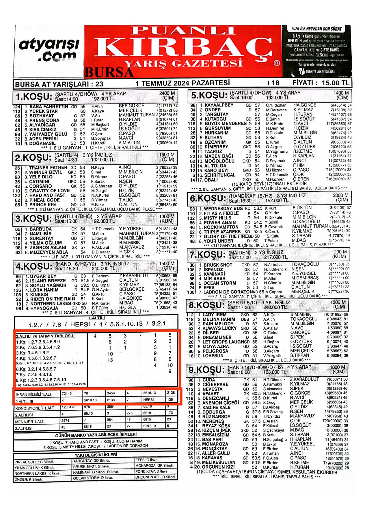 Bülteniniz Kırbaç ve yazarlarımızdan İhsan BİLGİLİ, 01 temmuz 2024 tarihli, 2.949 ₺ ikramiye tutarlı, Bursa 2.Altılısını tahminlerinde bularak okurlarımıza kazandırdı. Değerlendiren okurlarımızı tebrik ederiz.