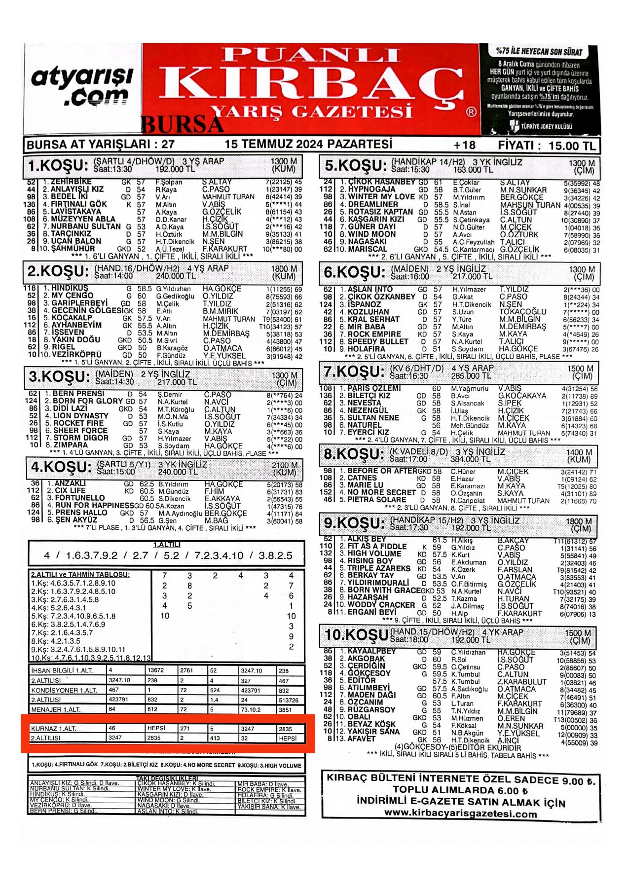 Yazarlarımızdan Kurnaz, 15.07.2027 Tarihli, 2 misli toplamda 5.206 ₺ ikramiye tutarlı, Bursa 2.Altılısını tahmininde bularak okurlarımıza kazandırdı.