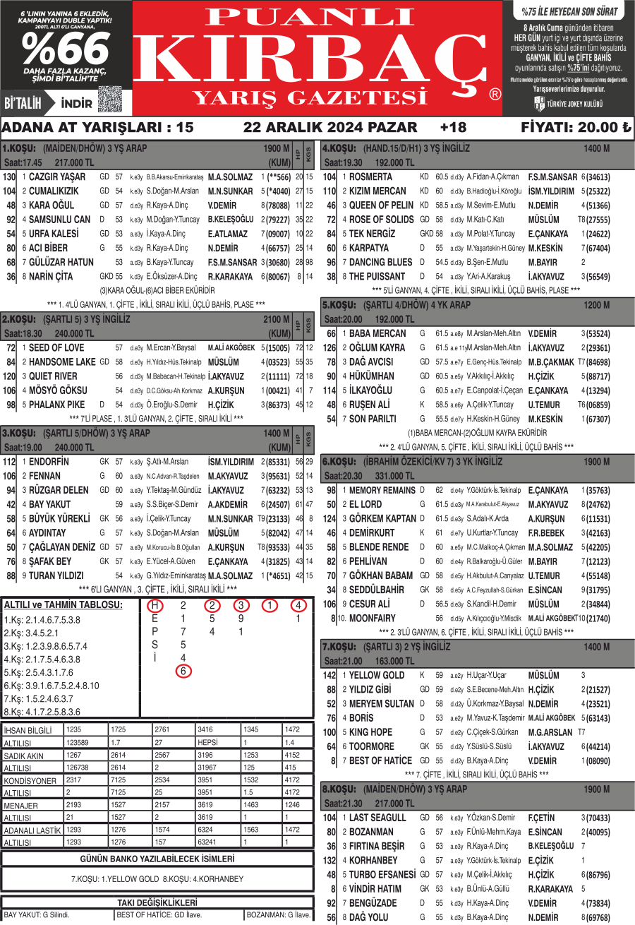 Bülteniniz Kırbaç, 22.12.2024 Tarihli, 1.231 ₺ ikramiye tutarlı Adana altılısını tahmininde bularak okurlarımıza kazandırdı.