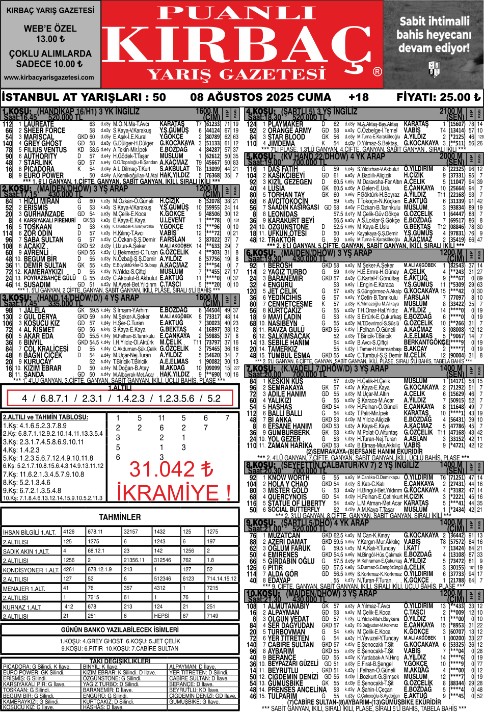 Bülteniniz Kırbaç, 08.08.2025 Tarihli, 2 Misli Toplamda 31.042 ₺ ikramiye tutarlı, İstanbul 1.Altılısını tahmininde bularak okurlarımıza kazandırdı.