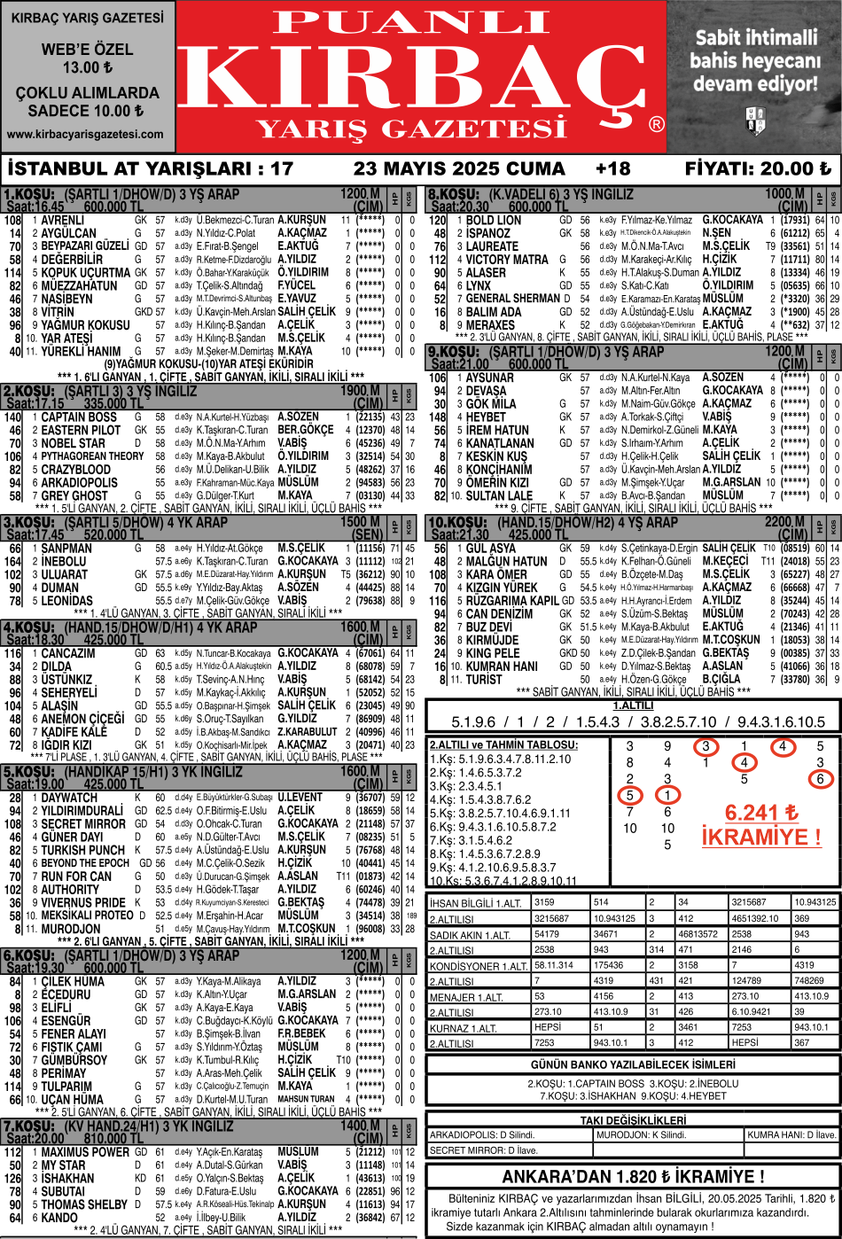Bülteniniz KIRBAÇ ve yazarlarımızdan KURNAZ, 23.05.2025 Tarihli, 6.241 ₺ ikramiye tutarlı, İstanbul 2.Altılısını tahminlerinde bularak okurlarımıza kazandırdı.