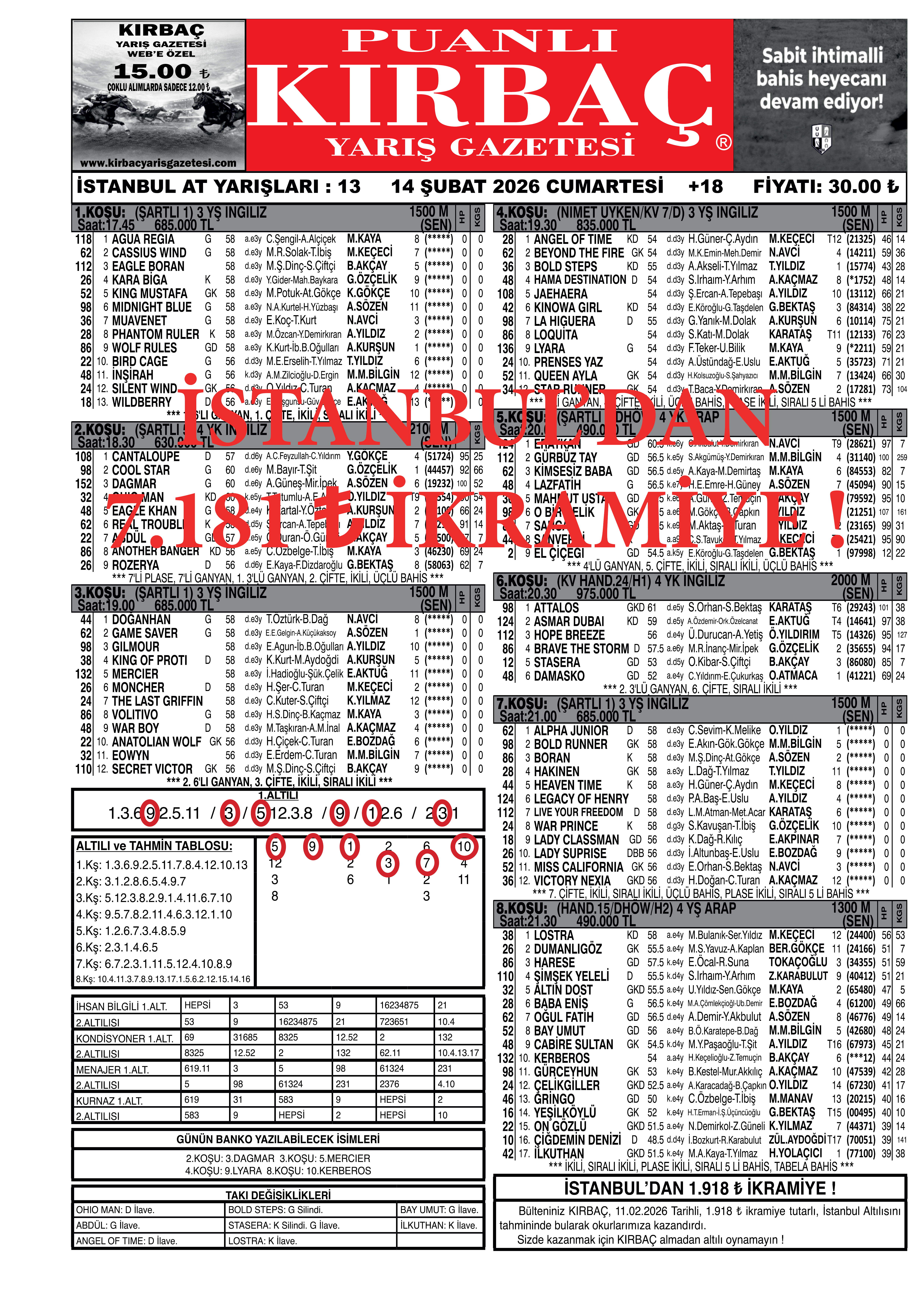 Bülteniniz KIRBAÇ, 14.02.2026 Tarihli, 2.837 ₺ ikramiye tutarlı İstanbul 1.Altılısı ve 4.344 ₺ ikramiye tutarlı İstanbul 2.Altılısını tahmininde bularak okurlarımıza kazandırdı.