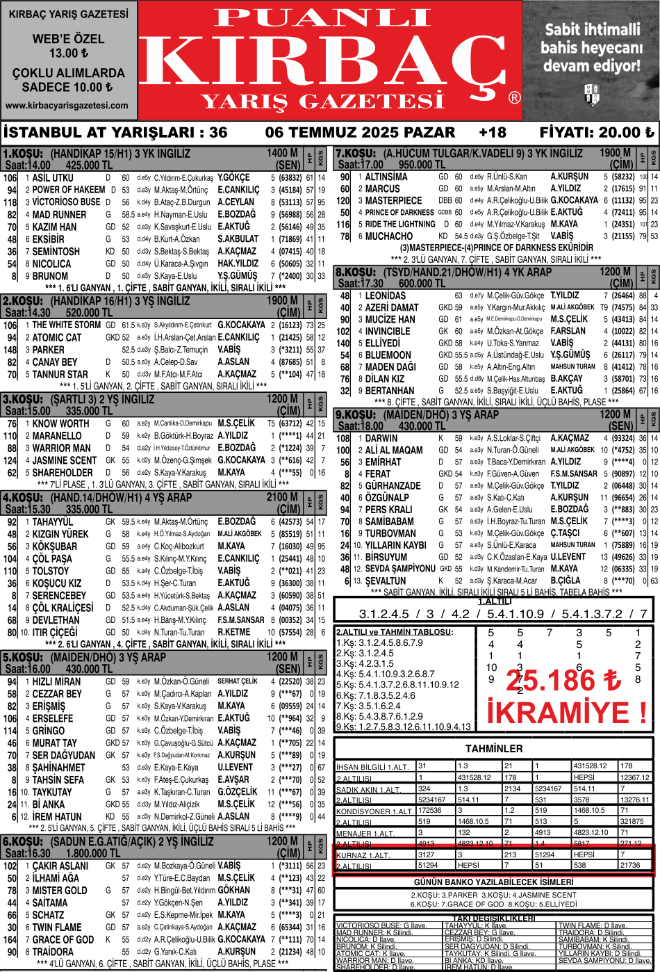 Yazarlarımızdan KURNAZ, 06.07.2025 Tarihli, 1.395 ₺ ikramiye tutarlı İstanbul 1.Altılısı ve 23.791 ₺ ikramiye tutarlı İstanbul 2.Altılısını tahmininde bularak okurlarımıza kazandırdı.