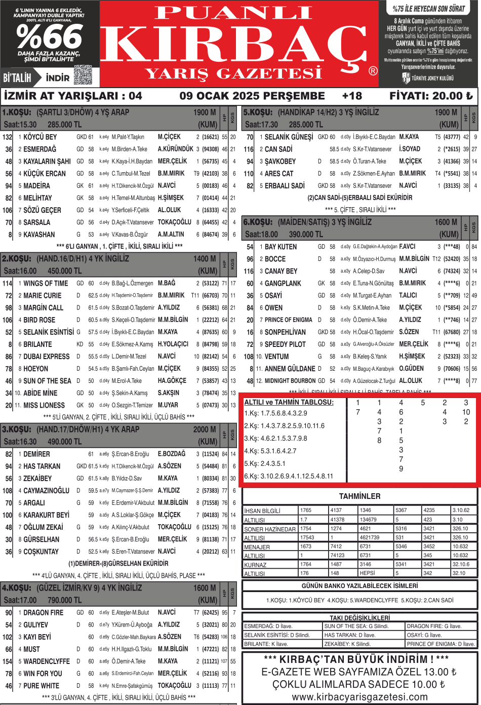 Bülteniniz Kırbaç, 09.01.2025 Tarihli, 2 Misli toplamda 1.800 ₺ ikramiye tutarlı, İzmir altılısını tahmininde bularak okurlarımıza kazandırdı.