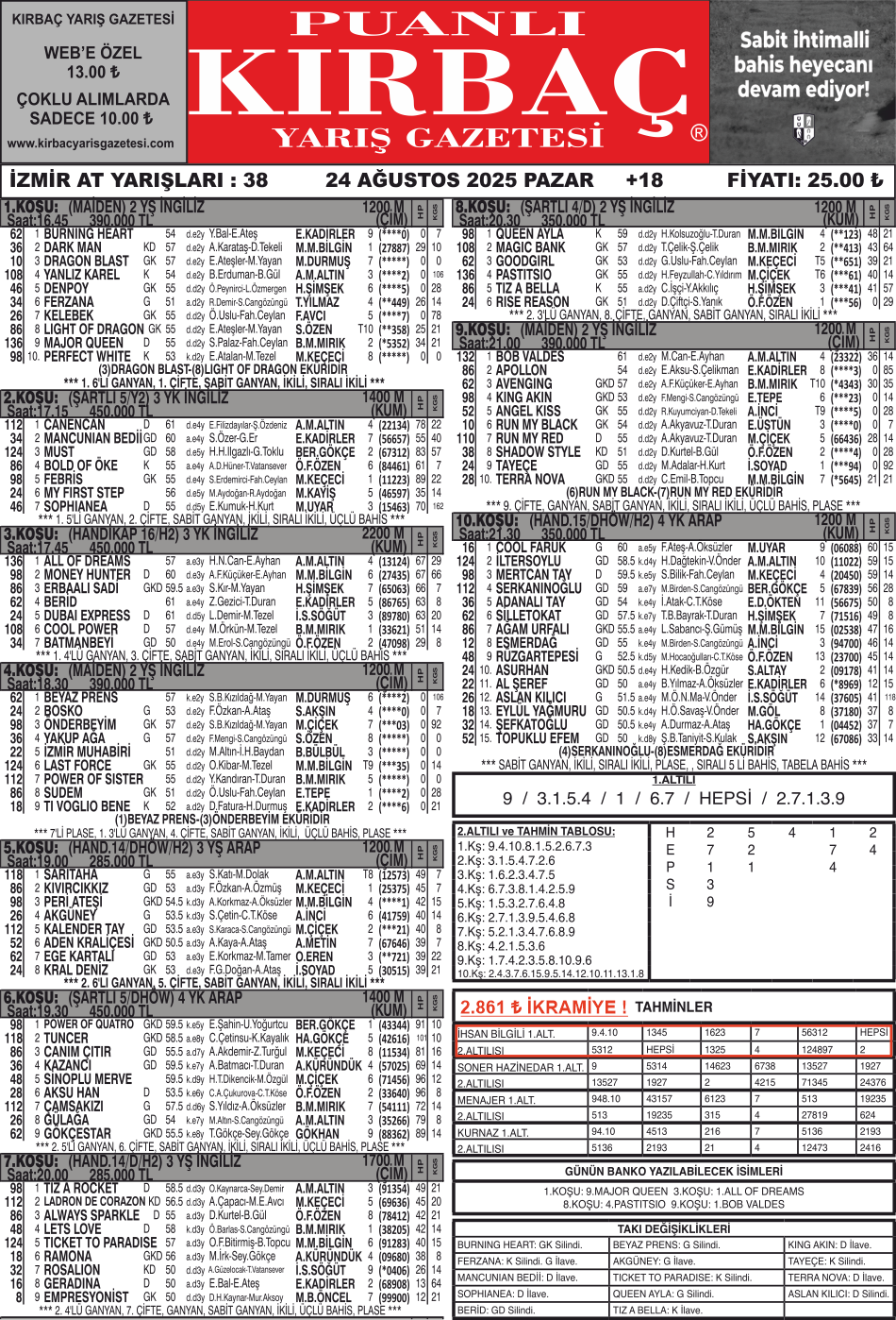 Yazarlarımızdan İhsan BİLGİLİ, 24.08.2025 Tarihli, 2.861 ₺ ikramiye tutarlı İzmir 2.Altılısını tahmininde bularak okurlarımıza kazandırdı.