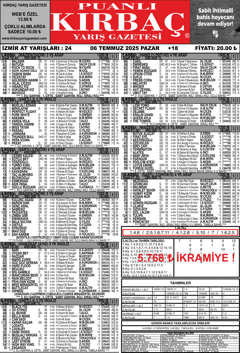 Bülteniniz KIRBAÇ, 06.07.2025 Tarihli, 2 Misli toplamda 5.768 ₺ ikramiye tutarlı İzmir 1.Altılısını tahmininde bularak okurlarımıza kazandırdı.