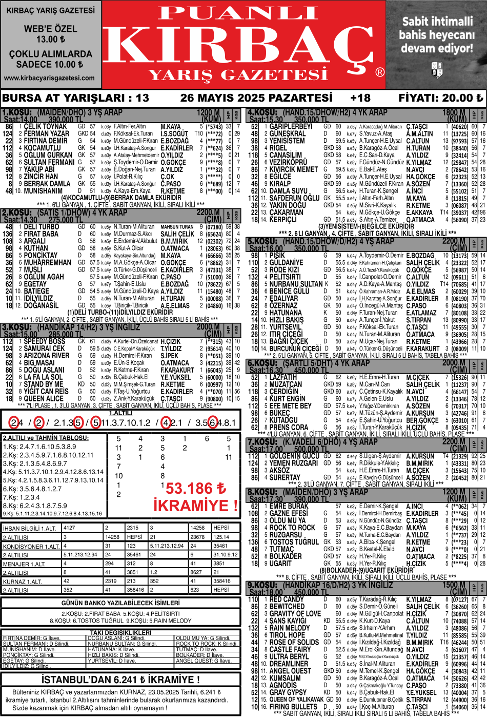 Bülteniniz KIRBAÇ, 26.05.2025 Tarihli, 2 Misli 53.186 ₺ ikramiye tutarlı BURSA altılısını tahmininde bularak okurlarımıza kazandırdı.