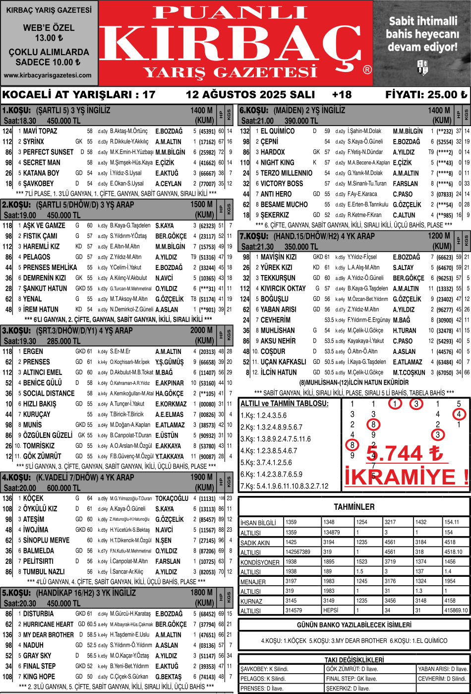 Bülteniniz KIRBAÇ, 12.08.2025 Tarihli, 5.744 ₺ ikramiye tutarlı, Kocaeli altılısını tahmininde bularak okurlarımıza kazandırdı.