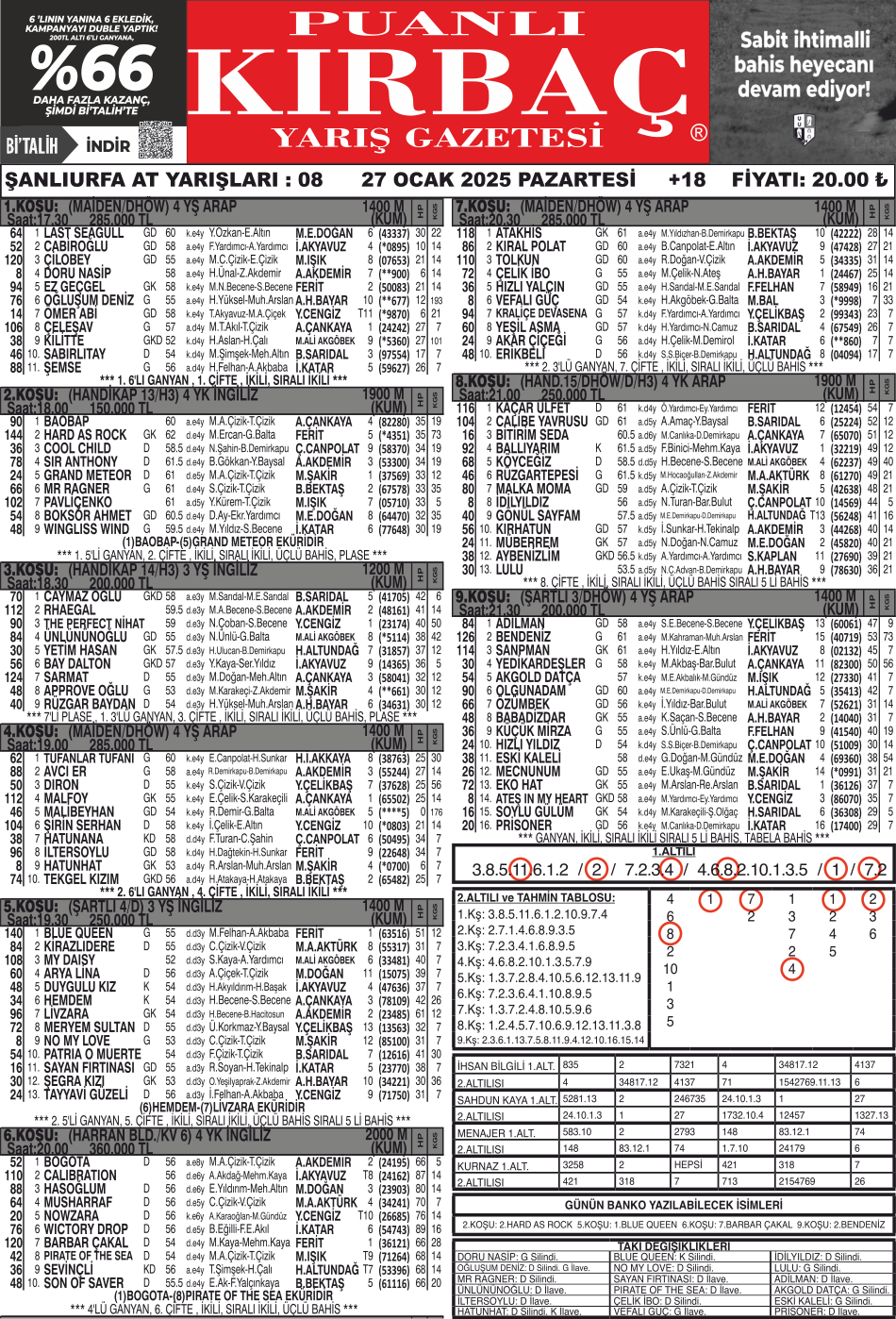 Bülteniniz KIRBAÇ, 27.01.2025 Tarihli, 1.114 ₺ ikramiye tutarlı Şanlıurfa 1.Altılısı ve 3.858 ₺ ikramiye tutarlı Şanlıurfa 2.Altılısını tahmininde bularak okurlarımıza kazandırdı.