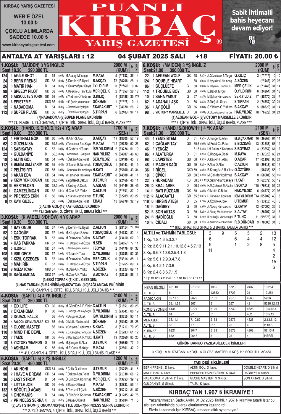 Bülteniniz KIRBAÇ, 04.02.2025 tarihli, 1.219 ₺ ikramiye tutarlı, Antalya altılısını tahmininde bularak okurlarımıza kazandırdı. Sizde kazanmak için KIRBAÇ almadan altılı oynamayın !  ...