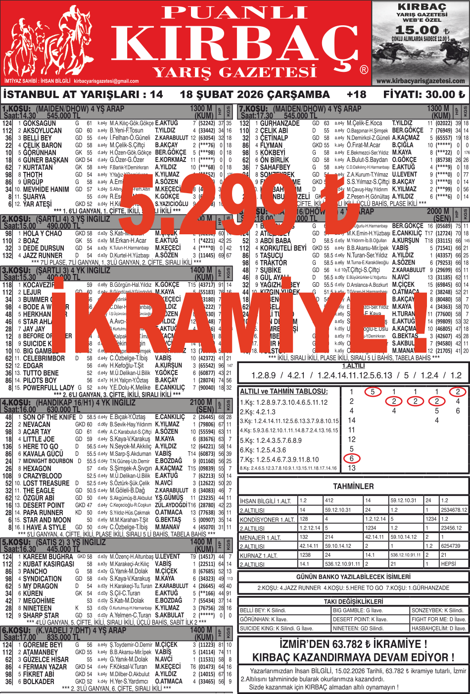 Bülteniniz KIRBAÇ, 18.02.2026 Tarihli, 5.299 ₺ ikramiye tutarlı İstanbul 2.Altılısını tahmininde bularak okurlarımıza kazandırdı. Sizde kazanmak için KIRBAÇ almadan altılı oynamayın !  ...