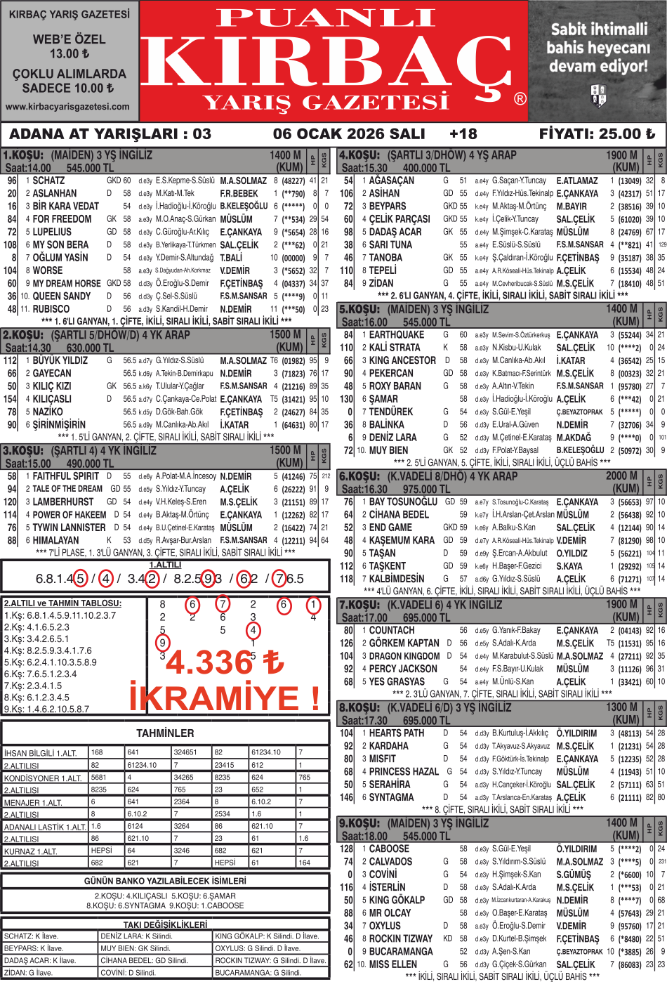 Bülteniniz KIRBAÇ, 06.01.2026 Tarihli, 3.666 ₺ ikramiye tutarlı Adana 1.Altılısı ve 670 ₺ ikramiye tutarlı Adana 2.Altılısını tahmininde bularak toplamda 4.336 ₺ ikramiye kazandırdı. Sizde kazanmak için KIRBAÇ almadan altılı oynamayın !  ...