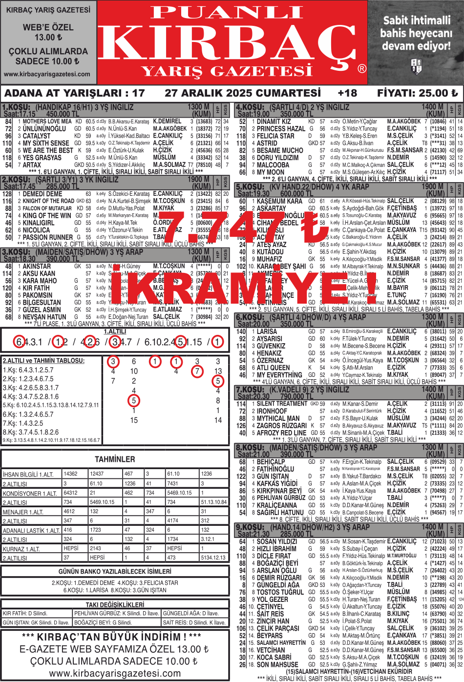 Bülteniniz KIRBAÇ, 27.12.2025 Tarihli, 1.599 ₺ ikramiye tutarlı Adana 1.Altılısı ve 6.148 ₺ ikramiye tutarlı Adana 2.Altılısını tahmininde bularak okurlarımıza kazandırdı.                          &n...