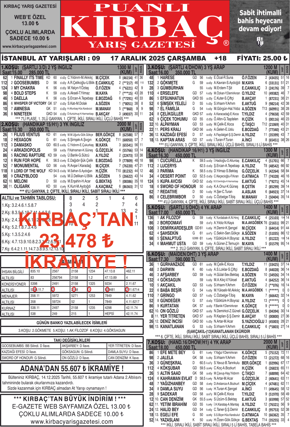Yazarlarımızdan İstanbul Kondisyonerimiz, 17.12.2025 Tarihli, 23.428 ₺ ikramiye tutarlı İstanbul 2.Altılısını tahmininde bularak okurlarımıza kazandırdı. Sizde kazanmak için KIRBAÇ almadan At Yarışı oynamayın !  ...
