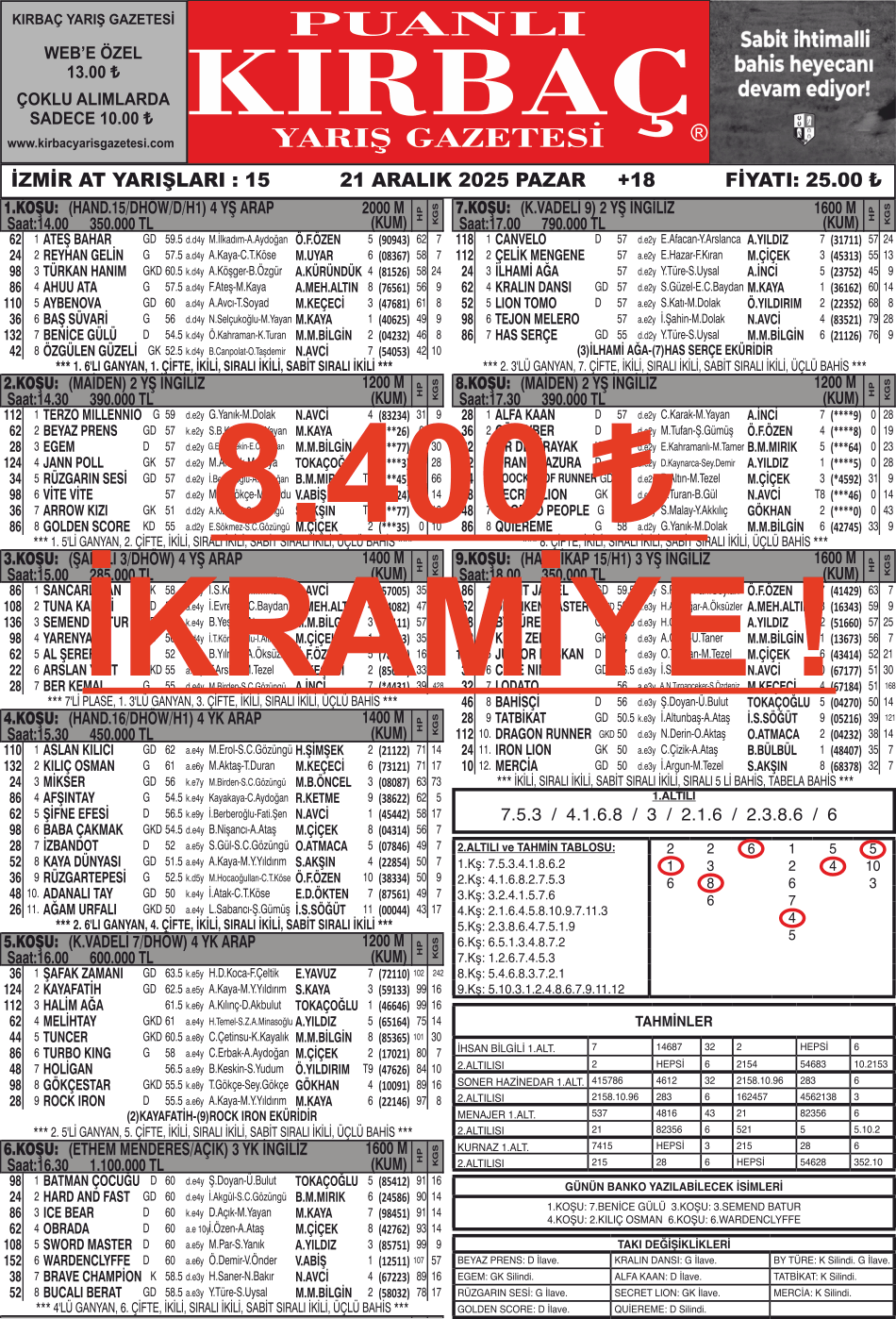 Bülteniniz KIRBAÇ, 21.12.2025 Tarihli, 2 Misli toplamda 8.400 ₺ ikramiye tutarlı İzmir 2.Altılısını tahmininde bularak okurlarımıza kazandırdı. Sizde kazanmak için KIRBAÇ almadan At Yarışı Oynamayın !  Bültene üye olarak ulaşabilirsi...