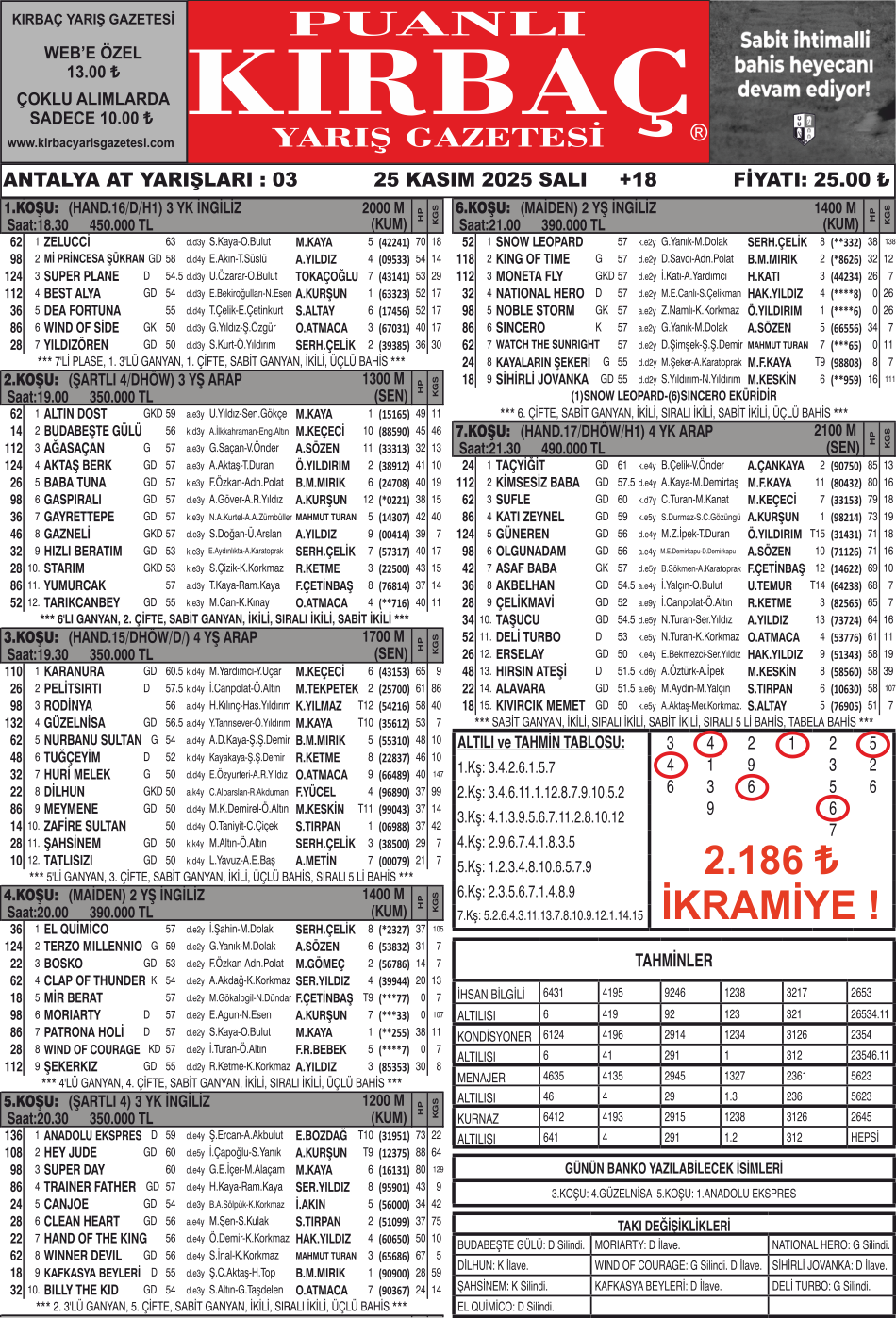 Bülteniniz KIRBAÇ, 25.11.2025 Tarihli, 2.186 ₺ ikramiye tutarlı Antalya altılısını tahmininde bularak okurlarımıza kazandırdı.  Sizde kazanmak için KIRBAÇ almadan altılı oynamayın ! ...