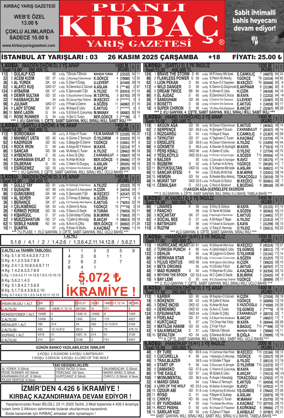 Yazarlarımızdan İhsan BİLGİLİ ve KURNAZ, 26.11.2025 Tarihli 5.072 ₺ ikramiye tutarlı İstanbul 1.Altılısını tahminlerinde bularak okurlarımıza kazandırdı. Sizde kazanmak için KIRBAÇ almadan altılı oynamayın !  ...