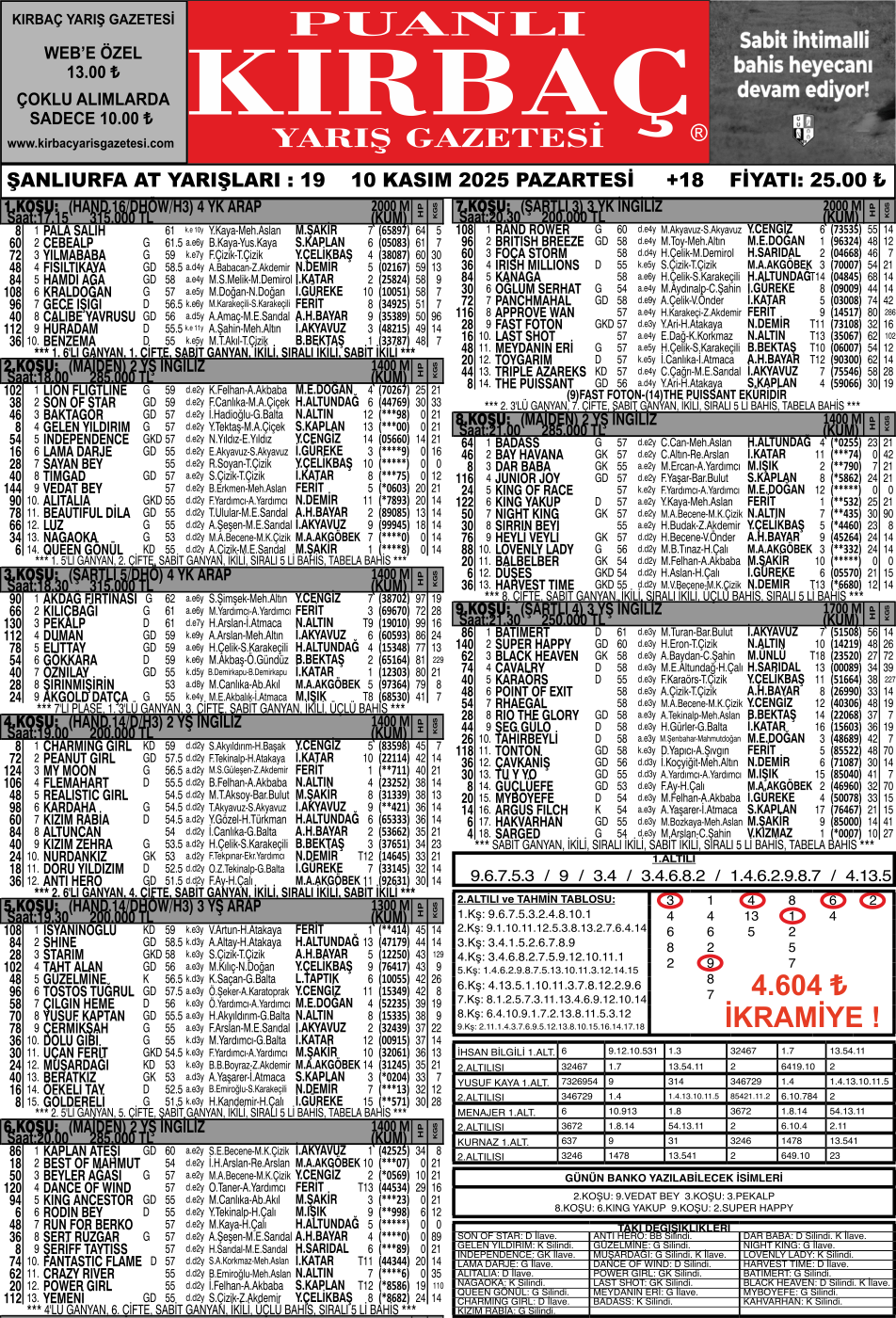 Bülteniniz KIRBAÇ, 10.11.2025 Tarihli, 4.604 ₺ ikramiye tutarlı, Şanlıurfa 2.Altılısını tahminde bularak okurlarımıza kazandırdı. Sizde kazanmak için KIRBAÇ almadan altılı oynamayın !  ...