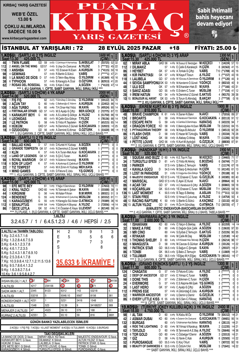 Yazarlarımızdan İhsan BİLGİLİ, 28.09.2025 Tarihli, 21.276 ₺ ikramiye tutarlı İstanbul 1.Altılısı ve Bülteniniz KIRBAÇ, 14.357 ₺ ikramiye tutarlı İstanbul 2.Altlısını tahmininde bularak okurlarımıza toplamda 35.633 ₺ ikramiye kazandırdı.     Sizde kazanmak i...