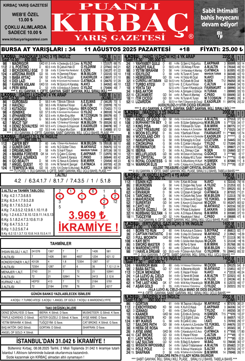 Bülteniniz KIRBAÇ, 11.08.2025 Tarihli, 3.969 ₺ ikramiye tutarlı, Bursa 2.Altılısını tahmininde bularak okurlarımıza kazandırdı. Sizde kazanmak için KIRBAÇ almadan altılı oynamayın ! ...