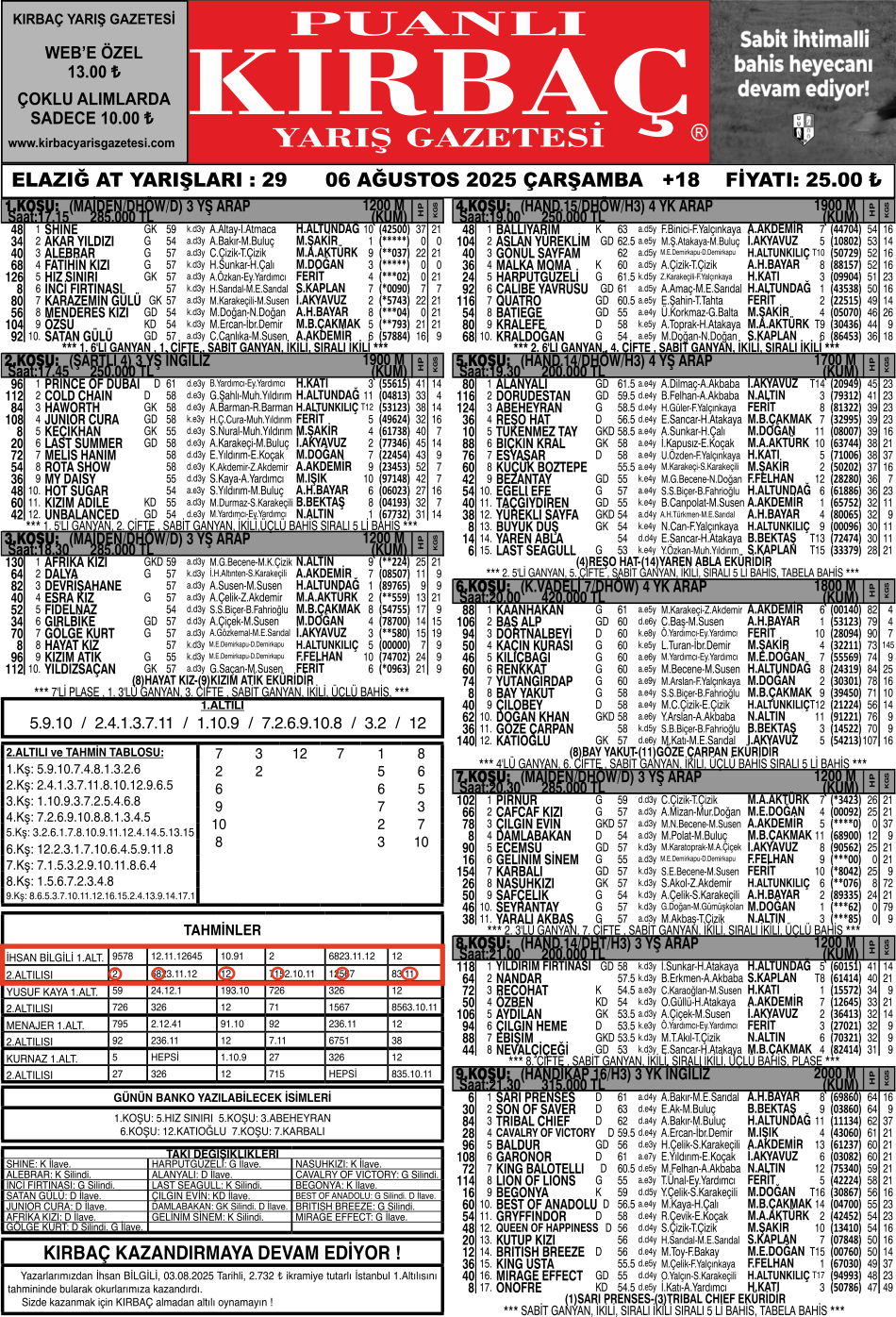 Yazarlarımızdan İhsan BİLGİLİ, 06.08.2025 Tarihli, 6.185 ₺ ikramiye tutarlı, Elazığ 2.Altılısını tahmininde bularak okurlarımıza kazandırdı. Sizde kazanmak için KIRBAÇ almadan altılı oynamayın ! ...