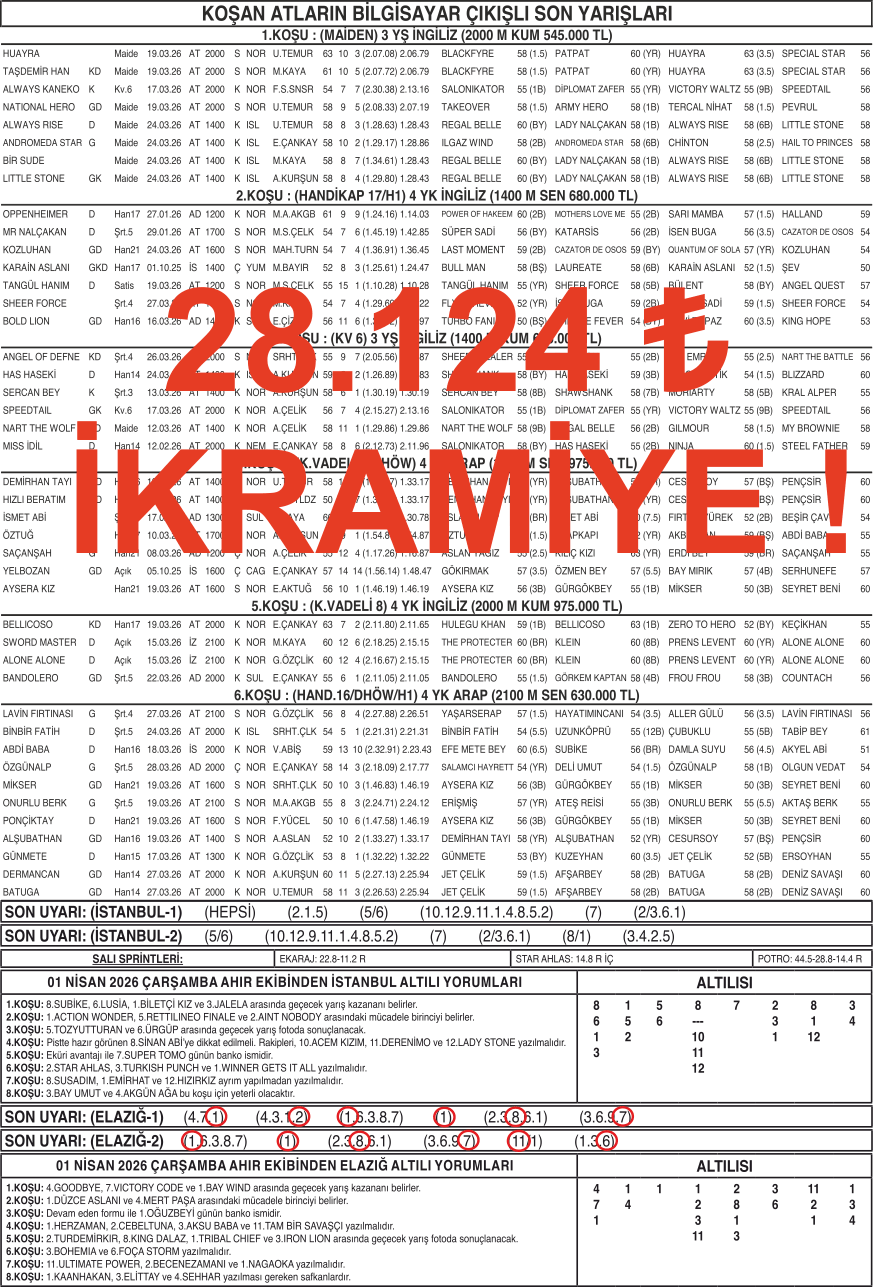 Bülteniniz KIRBAÇ, 01.04.2026 Tarihli, 25.421 ₺ ikramiye tutarlı Elazığ 1.Altılısı ve 2.703 ₺ ikramiye tutarlı Elazığ 2.Altılısını Son Uyarı tahmininde bularak okurlarımıza kazandırdı.      Sizde kazanmak için KIRBAÇ almadan altılı oyna...